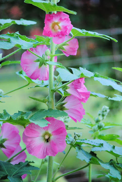 These lovely pink hollyhocks are part of a row from a packet of seeds promising mixed colors.